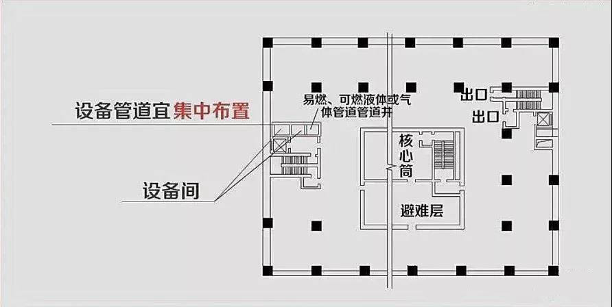 設(shè)備管理宜集中布置,其中的易燃、可燃液體或氣體管道應(yīng)集中布置,設(shè)備管道區(qū)應(yīng)采用耐火極限不低于3.00h的防火隔墻與避難區(qū)分隔。管道井和設(shè)備間應(yīng)采用耐火極限不低于2.00h的防火隔墻與避難區(qū)分隔,管道井和設(shè)備間的門不應(yīng)直接開向避難區(qū);確需直接開向避難區(qū)時,與避難層區(qū)出入口的距離不應(yīng)小于5m,且應(yīng)采用甲級防火門。