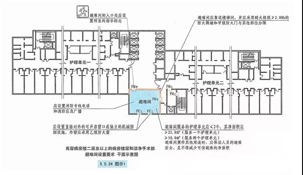 2、為了滿足高層病房樓和手術(shù)室中難以在火災(zāi)時及時疏散的人員的避難需要和保證其避難安全,高層病房樓應(yīng)在二層及以上各樓層和潔凈手術(shù)部設(shè)置避難間,避難間可以利用平時使用的房間,如每層的監(jiān)護(hù)室,也可以利用電梯前室。病房樓按最少3部病床梯對面布置,其電梯前室面積一般為24m²~30m²。但合用前室不適合用作避難間,以防止病床影響人員通過樓梯疏散,避難間的其他防火設(shè)計和消防設(shè)施應(yīng)符合規(guī)范5.5.24要求,如圖所示: