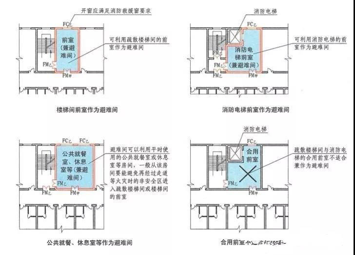 避難層可供避難的凈面積不應(yīng)小于12㎡,避難間可利用疏散樓梯間的前室和消防電梯的前室,避難間可以利用平時使用的公共就餐室或休息室等房間,一般從該房間要能避免再經(jīng)過走道等火災(zāi)時的非安全區(qū)進(jìn)入疏散樓梯間或樓梯間的前室;避難間的門可直接開向前室或疏散樓梯間。