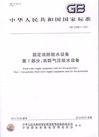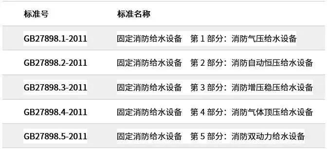 在2011年12月30日,國家又頒布了《GB27898:固定消防給水設備》;該標準作為GA30.2的升級標準,一共分為5個部分,(見下表):
