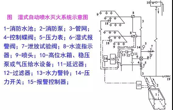 組成:濕式系統(tǒng)由閉式噴頭、濕式閥、水力警鈴和供水管路等組成,為噴頭常閉的滅火系統(tǒng)。