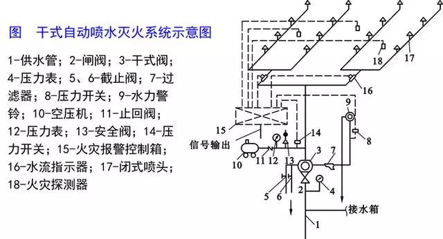 系統(tǒng)特點:為噴頭常閉的滅火系統(tǒng),管網中平時不充水,只充有有壓空氣(或氮氣),故稱之為干式系統(tǒng)。當建筑物發(fā)生火災火點溫度達到開啟閉時噴頭時,噴頭開啟排氣、充水滅火,為噴頭常閉的滅火系統(tǒng)。