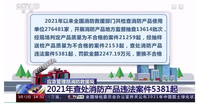 2021年以來,全國消防救援部門共檢查消防產(chǎn)品使用單位276481家,查處消防產(chǎn)品違法案件5381起,罰款金額2247.19萬元 。