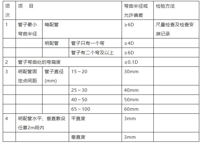 (7)按不同檢查部位、內(nèi)容各抽查20處,電線保護管彎曲半徑,明配管安裝允許偏差和檢驗方法符合下表規(guī)定。