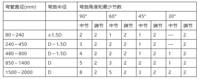 (1)圓形彎管的彎曲半徑(以中心線計)和最少節(jié)數(shù)應(yīng)符合表2的規(guī)定。