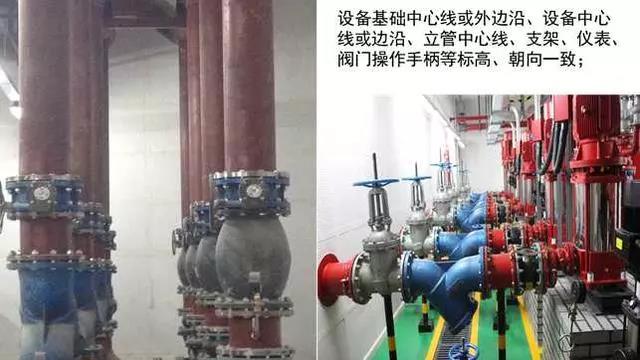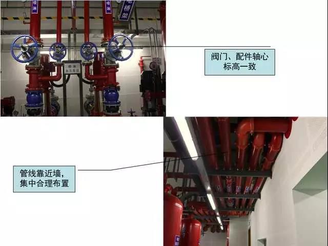 質量控制要點:成排成線,部件標高、朝向一致,維護方便,各專業(yè)必須依照綜合管線布置圖施工(距離管線彎頭500mm范圍內(nèi)應設置支吊架)。