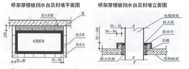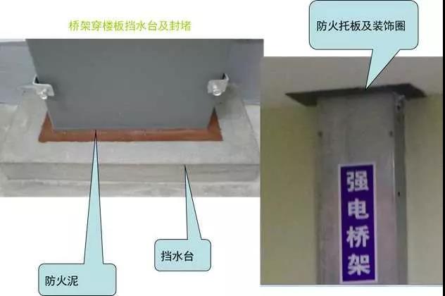 5)電井應設門檻,橋架、插接母線在地面或穿樓板處有不低于50mm的擋水臺,橋架、插接母線穿樓板處應做20~30mm防火封堵,頂部設置防火托板,加裝飾圈。