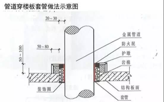當管道穿過防火堤、防火墻、樓板時,應安裝套管。穿防火堤和防火墻的套管長度不應小于防火堤和防火墻的厚度,穿樓板套管長度應高出樓板50mm,底部與樓板底面相平;管道與套管間的空隙應采用防火材料封堵。