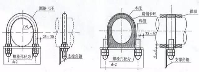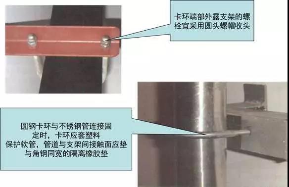 選擇與管徑匹配的卡環(huán),卡環(huán)安裝固定螺栓孔應保證管道順直且居卡環(huán)中間,卡環(huán)與管道應接觸緊密。圓鋼卡環(huán)與不銹鋼管、銅管連接固定時,卡環(huán)應套塑料保護軟管,管道與支架間接觸面應墊與角鋼同寬的隔離橡膠墊。扁鋼卡環(huán)應與木托同寬,與螺栓應滿焊連接;在與支架連接處應垂直,扁鋼端部與支架宜留有5~8mm收縮余量,卡環(huán)端部外露支架的螺栓宜采用圓頭螺帽收頭,油漆涂刷應均勻。