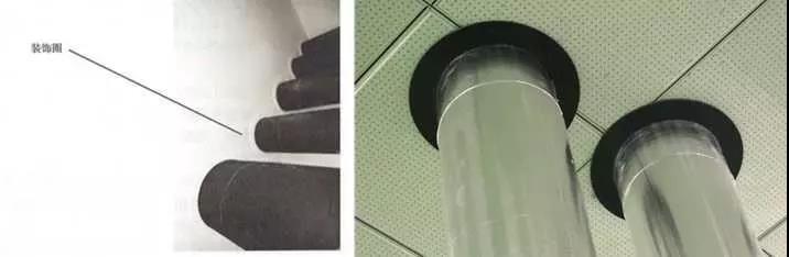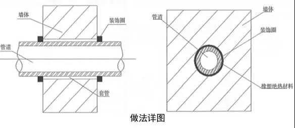 2、保溫管道穿墻處理:保溫管道穿墻、板時,保溫層應連續(xù)。應采用橡塑保溫管(板)進行穿墻、穿樓板保溫,用橡塑專用膠粘接牢固,接縫嚴密,兩端與墻面平齊,對接嚴密平整,兩側加牢固規(guī)整裝飾圈保護。保溫管(板)與墻、板面根部應粘貼裝飾圈,接縫應放在頂部或正視不明顯處,裝飾圈寬度20~50mm。
