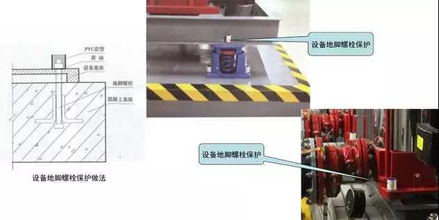 2、設備地腳螺栓防水防腐保護:對室外和多水房間安裝的設備地腳螺栓,根據(jù)設備地腳螺母大小及螺栓外露長度確定套管的直徑及高度,成排或同一區(qū)域內(nèi)螺栓外露長度應一致,以確保套管高度一致且覆蓋螺栓頂面5mm。套管直徑與螺母直徑匹配,套管安裝后用黃油填塞套管與螺栓之間的間隙,上口與套管平齊。