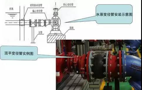 3、水泵吸水、出水變徑管安裝質量控制要點:水泵吸水口安裝上平偏心大小頭,出水口安裝同心大小頭,螺栓外露長度不大于螺桿直徑的1/2,且長度一致。