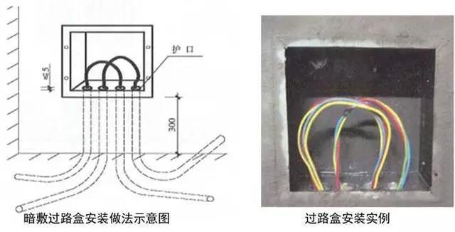 1、過路接線盒:在導管敷設時,按照規(guī)范要求在適當位置設置過路接線盒。過路盒安裝時距地高度宜為300mm;在結構板內(nèi)安裝過路盒時,應用扎絲綁緊,盒內(nèi)填充密實,表面用膠帶密封;導管應垂直進入線盒,焊接管絲頭伸入線盒內(nèi)長度不大于5mm,盒子內(nèi)外鋼管鎖母上緊,(或KBG、JDG管可用盒接頭與過路接線盒連接)接地,用φ6圓鋼在焊管間、焊管與過路盒間進行接地跨接;盒內(nèi)穿線應留有適當余量;管口加護口;安裝過路盒面板,面板緊貼墻面或頂面。