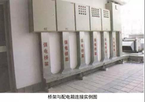 3、橋架與配電箱的連接:配電箱頂部劃線、鉆孔,用電鋸開條形孔,清理孔邊沿毛刺,孔兩端為弧形,兩端尺寸小于橋架寬度10mm左右,厚度小于等于橋架厚度的80%,孔中心與橋架中心對應,開孔處補漆,孔周邊粘貼橡膠條護口。箱體與橋架用1~1.5mm厚、90°的橋架連接片連接,連接螺栓絲頭朝外,加設專用墊片,刃面朝向橋架連接片,螺栓外露2~3扣絲。橋架與箱體采用4mm²黃綠雙色多股軟銅線或編織軟銅線接地跨接。