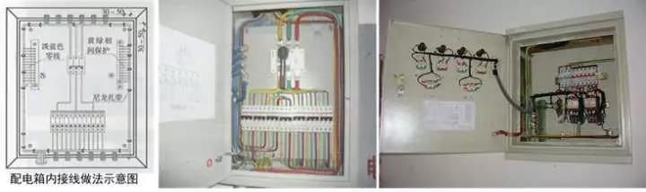 4、箱(柜)內(nèi)接線:先將線(纜)理順,按照100~200mm的間距用尼龍扎帶進行綁扎,拐角兩側30~50mm及分支處應設扎帶,按照黃色(L1)、綠色(L2)、紅色(L3)、淡藍色(N)、黃綠相間色(PE)分別接入A相、B相、C相、N線、PE線端子上,多股線應壓接線端子;標識:應在N、PE端子排附近刻寫或粘貼“N"、“PE”標識,進入配電盤的外部回路應扎回路牌,進入配電盤的控制線在導線套上號碼管;接地:配電箱(柜)的接地螺栓、箱門上的接地螺栓、電源進線回路的PE線、配電箱饋出各個回路的PE線、與配電箱連接金屬導管均應PE端子直接連接,導通良好。