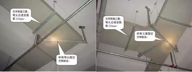 2、橋架三通安裝:根據(jù)電纜橋架走向,按照最大電纜直徑的10~15倍選擇三通形式和彎曲半徑。在距三通接口500mm處設置支架,橋架寬度大于800mm時,應在三通底部增加支架。兩段橋架與橋架、橋架與支架之間跨接接地。