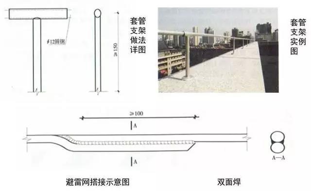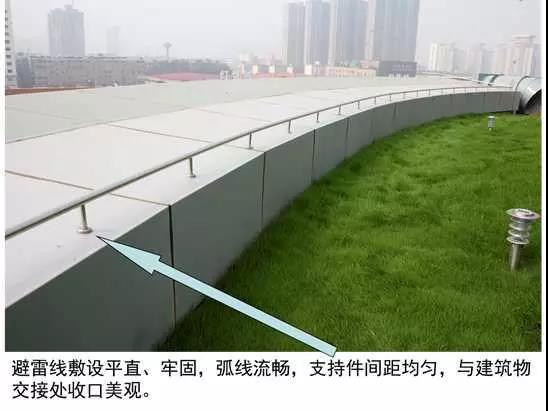 3、圓鋼避雷帶敷設:按設計位置彈線、定位,一般情況下,避雷帶應居女兒墻(屋脊)中心,當女兒墻寬度大于300mm時,支架布設于距外沿150mm處,距變形縫、轉彎300mm處設支架,直線段支架均勻分布,間距不大于1m;支架埋深不小于80mm,出女兒墻頂面不小于150mm,調整、校正支架的垂直度,根部套不銹鋼裝飾圈并用耐候膠密封固定。圓鋼調直后敷設在支架上,轉彎、搭接、變形縫處圓鋼煨彎加工,轉彎處煨彎半徑為80~100mm,搭接處一端鋼筋煨乙字彎,與另一端圓鋼上下搭接,搭接長度為100mm,搭接點宜設在離支架不小于200mm位置處,雙面施焊,焊縫連接飽滿,焊渣清理干凈,焊接點應先刷防銹漆,再刷銀粉漆,防腐處理到位;變形縫處鋼筋煨成向下半圓形。將防雷引下線可靠焊接在避雷帶上。拉通線校正避雷帶的高度、平直度。