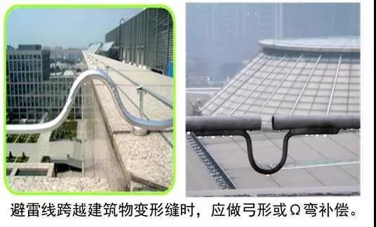屋頂設置避雷針或避雷線,主要作用是對建筑物和屋面設備起到保護作用。其質量控制主要為:屋面的設備、金屬構件、金屬管道、金屬支架、電氣設備金屬外殼都必須和接地干線可靠連接。避雷線安裝應平直,鍍鋅層完好,接頭應采用雙面焊接,圓鋼搭接長度6倍直徑,焊接焊口須防腐處理。引下線宜采用圓鋼或扁鋼。當采用圓鋼時,直徑不應小于8mm。當采用扁鋼時,截面不應小于48mm2,厚度不應小于4mm。對于裝設在煙囪上的引下線,圓鋼直徑不應小于12mm。扁鋼截面不應小于100mm2且厚度不應小于4mm。避雷帶跨越建筑物變形縫時,應設補償裝置。接閃器應熱鍍鋅,焊接處應涂防腐漆。在腐蝕性較強的場所,還應加大其截面或采取其他防腐措施。