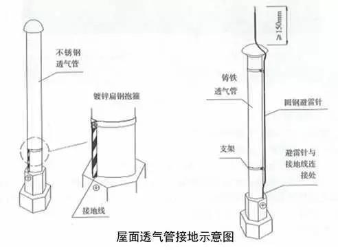 5、屋面金屬通氣管接地:采用鍍鋅扁鋼自屋面避雷網(wǎng)從透氣管根部引出,用抱箍沿透氣管固定,距根部或裝飾臺面間距300mm,根部與接地線連接,搭接長度不小于100mm,透氣管的連接部位做接地跨接。