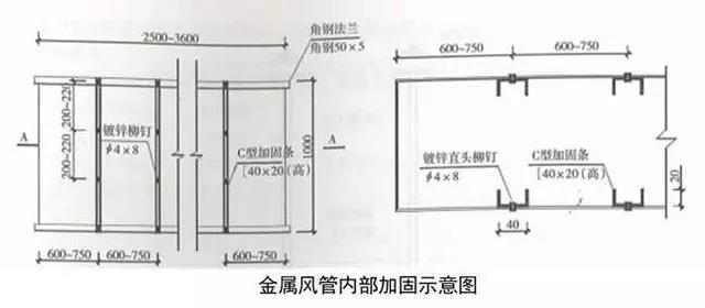 大口徑(b≥2500mm)鍍鋅鋼板風管加固:利用1.2mm厚的鍍鋅鋼板制作C形條,沿風管寬度方向將C形條按600~750mm間距鉚接。鉚釘按200~220mm間距鉚接在風管內(nèi)側。加固完成后安裝風管兩側法蘭。