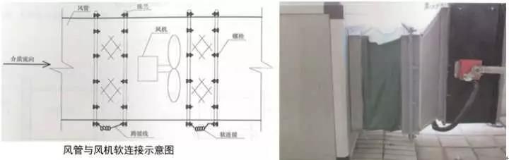 3、風管與風機軟連接:確定風管與風機之間的距離和同心性,距離要求150~200mm,風管、風機同心徑;制作軟接兩端法蘭,中低壓系統(tǒng)法蘭螺栓孔間距120~150mm,高壓及凈化系統(tǒng)距80~100mm,軟接長度為法蘭間距加20~30mm伸縮量,用鉚釘將軟接均勻平整的固定在法蘭上,鉚釘位置和法蘭螺栓位置對應,風機法蘭與風管法蘭螺栓孔對應,螺栓朝向與介質流向一致,螺栓外露長度為2~3扣絲。屋面與防暴場所采用不小于4mm²的黃綠雙色銅芯軟線壓接銅鼻子接地跨接。成排風機中心線應在一條線上。