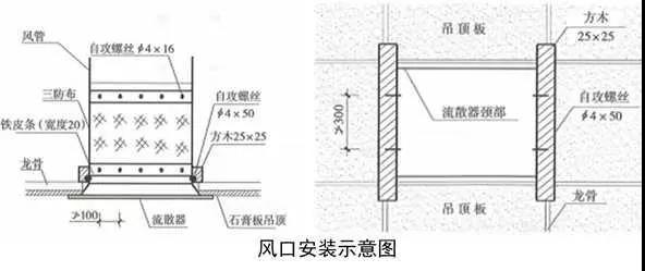 根據(jù)策劃后的圖紙,確定風口位置,在風口頸部用手槍鉆打眼,孔徑4mm,打眼間距不大于100mm,用自攻絲和1.5~2.0mm厚的金屬條將三防布固定到風口頸部。方木防火防腐處理后固定在吊頂龍骨上,用自攻絲將風口固定在方木上,自攻絲間距不大于300mm,校正風口,與吊頂結合嚴密。