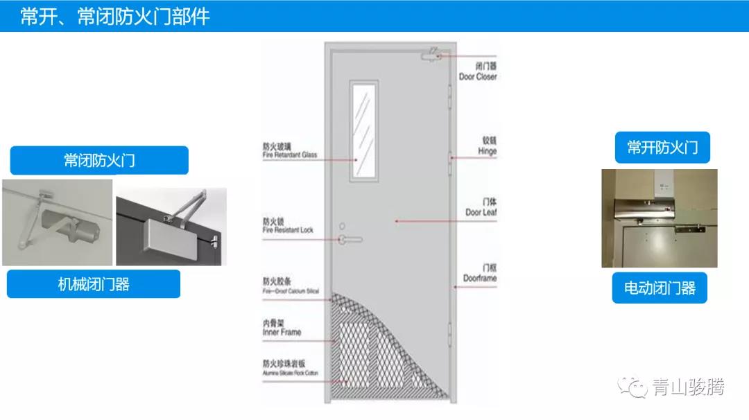 常開式防火門由門扇,門框,閉門器,密封條,釋放開關(guān)等部件組成,常閉式防火門除以上部件外還裝有順序器。