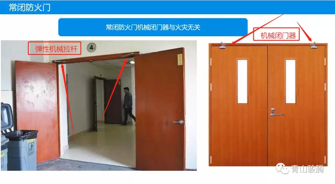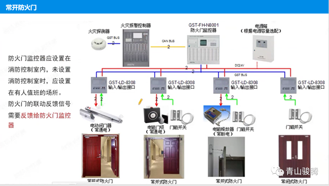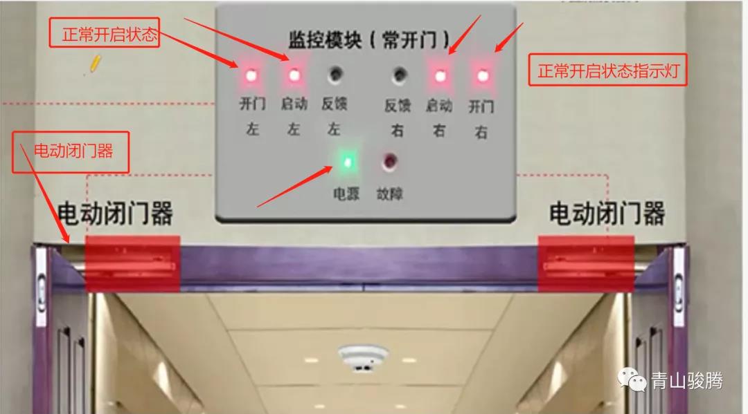 常開式防火門由防火門釋放開關(guān)控制,電動(dòng)式的。而常閉式防火門不需要設(shè)置電動(dòng)自動(dòng)控制,主要用閉門器,順序器進(jìn)行關(guān)閉,即機(jī)械式的。有的常閉防火門僅僅裝一個(gè)機(jī)械閉門器,我目前住的小區(qū)就是這種設(shè)計(jì),而有的現(xiàn)場設(shè)計(jì)常閉防火門帶一個(gè)模塊,通過門磁開關(guān)接通與否,來反饋給防火門分/主機(jī)處于的開(閉)狀態(tài),只連接一個(gè)信號(hào)線。