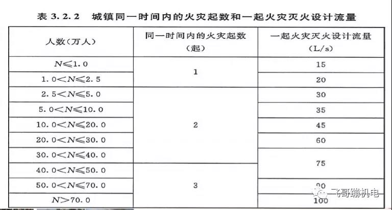 表3.2.2城鎮(zhèn)同一時(shí)間內(nèi)的火央起數(shù)和一起火災(zāi)滅火設(shè)計(jì)流量