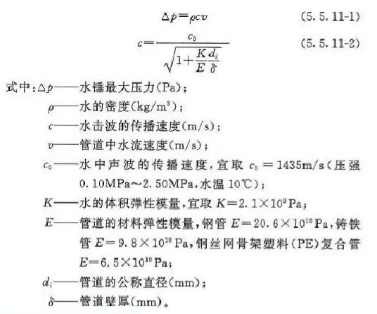•消防水泵出水管應(yīng)進(jìn)行停泵水錘壓力計(jì)算,并宜按下列公式計(jì)算,當(dāng)計(jì)算所得的水錘壓力值超過(guò)管道試驗(yàn)壓力值時(shí),應(yīng)采取消除停泵水錘的技術(shù)措施。停泵水錘消除裝置應(yīng)裝設(shè)在消防水泵出水總管上,以及消防給水系統(tǒng)管網(wǎng)其他適當(dāng)?shù)奈恢茫?nbsp;